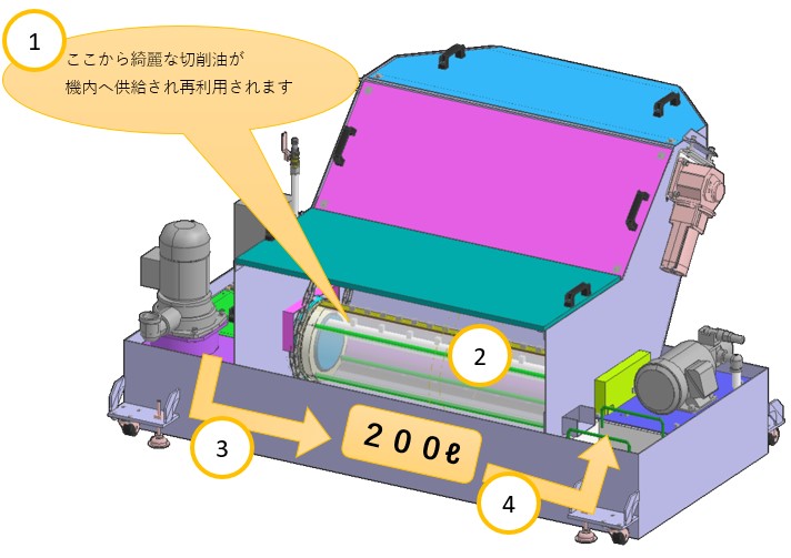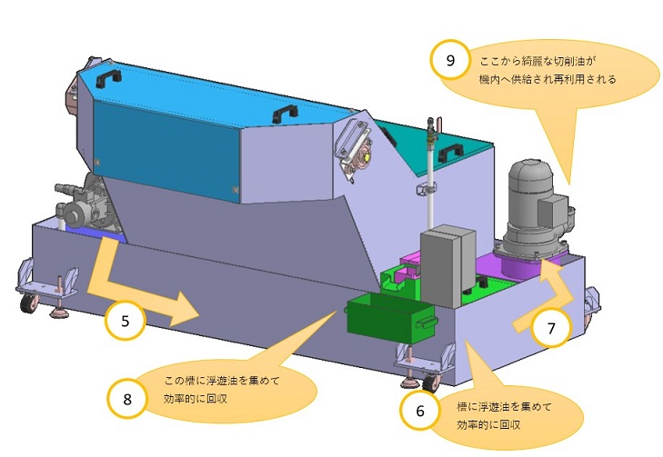 浮遊油とスラッジを効率的に分離、回収(濾過)することでクーラントを腐りにくくします。